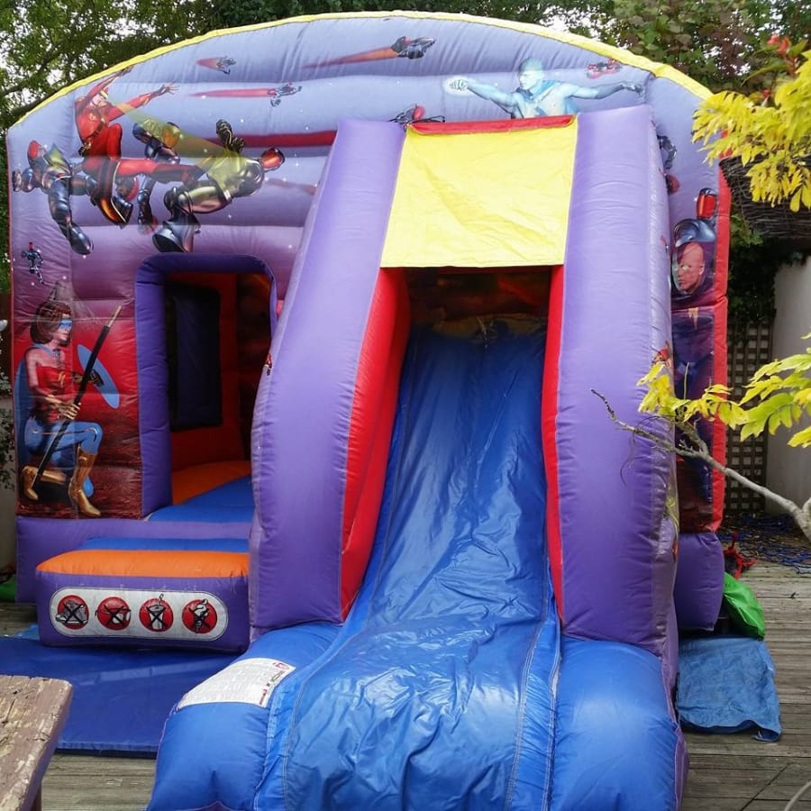 A fully featured Action Hero Bouncy Castle with Slide Combo with sewn in shower cover, deep